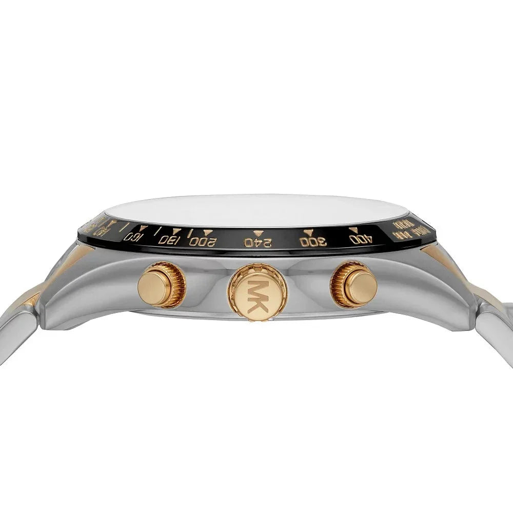 Michael Kors Layton 45mm watch features a Steel case with black tachymeter topring, black dial with stick indexes, chronograph movement and a two tone Steel bracelet with gold-tone center links.