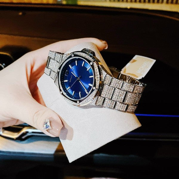 Michael Kors' 41mm Lennox watch features a navy sunray dial with white indexes, silver-tone pavé case with a faceted pavé topring, three-hand movement and all-over pavé stainless steel bracelet.