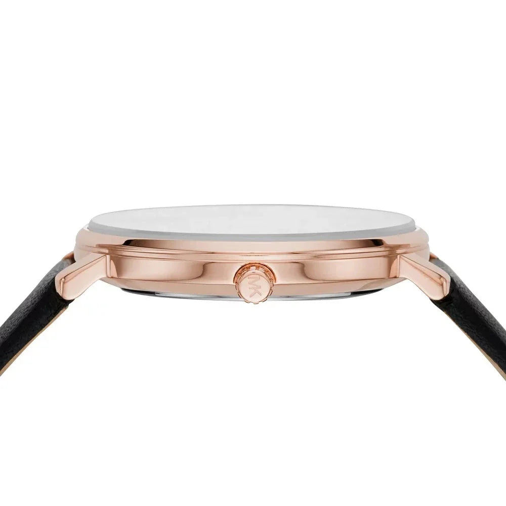 MK's Pyper watch is the definition of everyday elegance. Designed with a smooth leather strap, this rose gold-tone style features a minimalist dial. Wear it solo or stack it with coordinating styles for a glamorous effect. This 38mm watch features a white dial in a stainless steel case with three hand movement and a black leather strap.