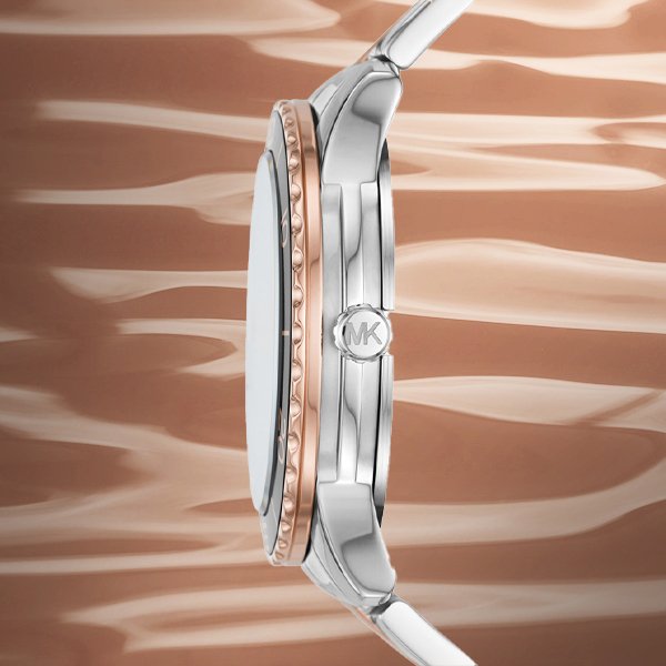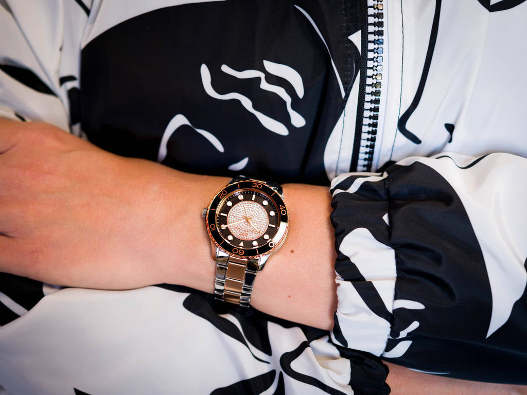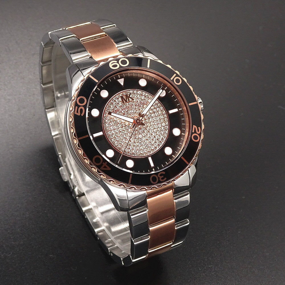 Stainless steel case with a two-tone (silver-tone and rose gold-tone) stainless steel bracelet. Fixed rose gold-tone bezel with an inlaid black ring. Black (crystal pave center) dial with luminous rose gold-tone hands and dots hour markers. Minute markers around the outer rim. Dial Type: Analog. Luminescent hands and markers. Quartz movement. Scratch resistant mineral crystal.