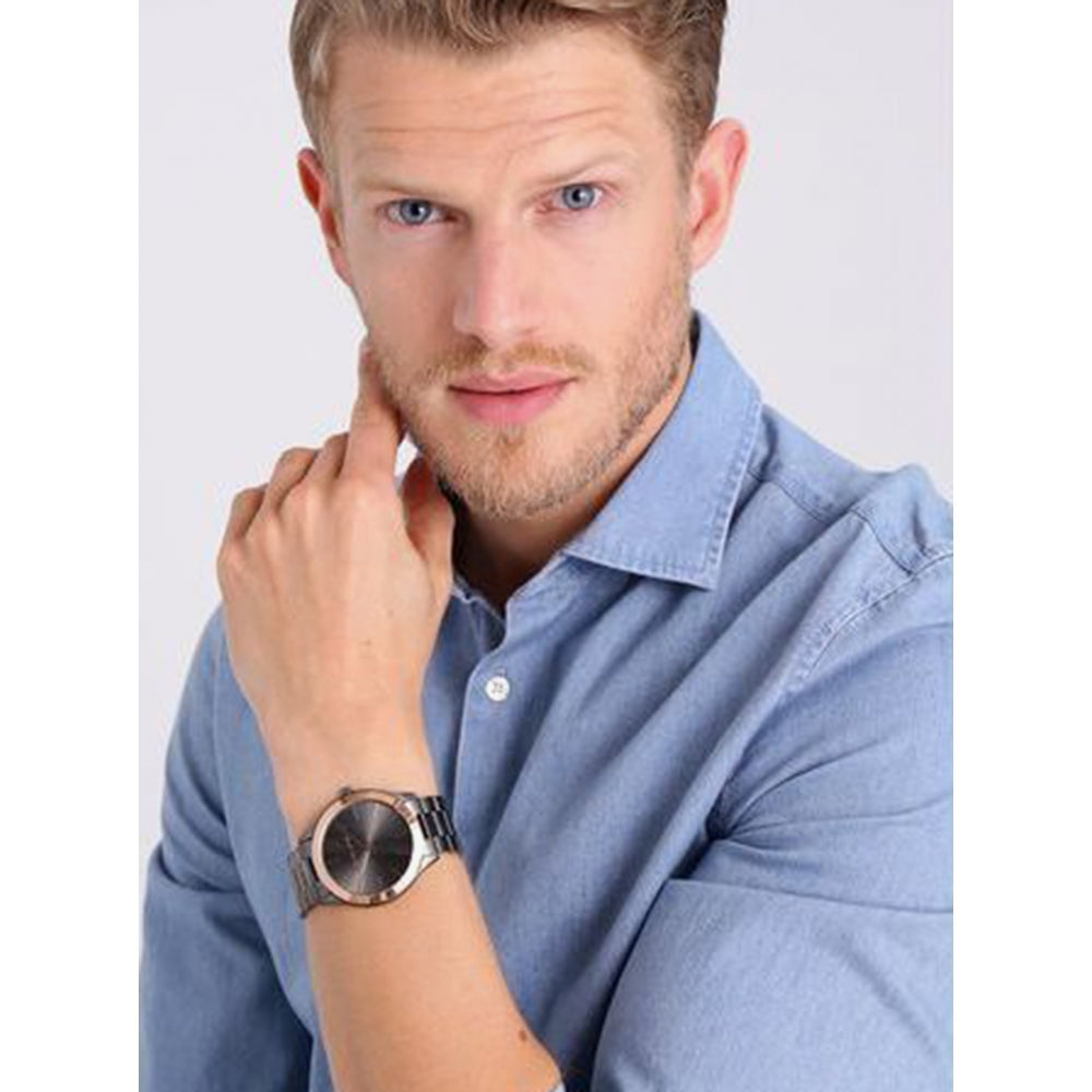 Gunmetal stainless steel case and bracelet. Fixed rose gold-tone bezel. Grey dial with rose gold-tone hands and index hour markers. Dial Type: Analog. Quartz movement. Scratch resistant mineral crystal.