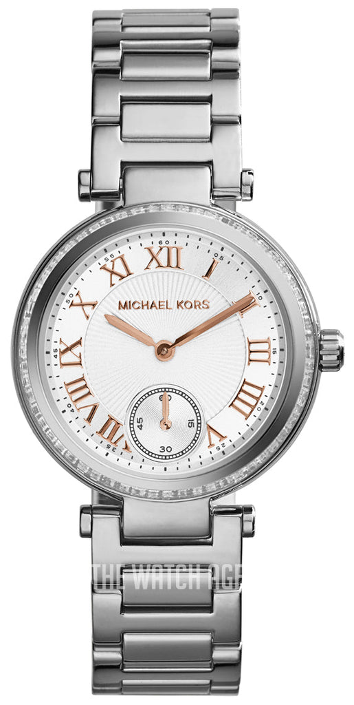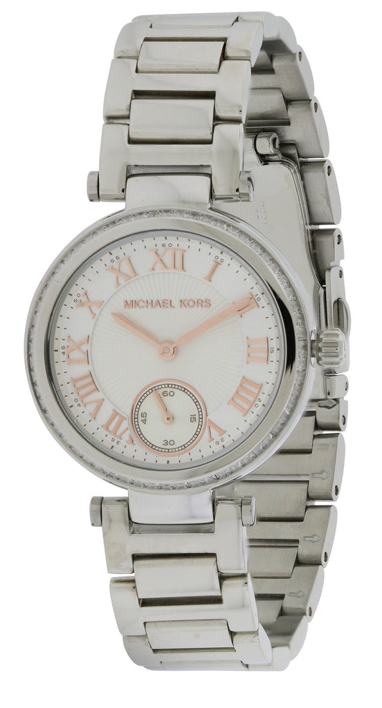 Scratch resistant mineral crystal. Pull / push crown. Solid case back. Case diameter: 33 mm. Round case shape. Band width: 16 mm. Deployment clasp. Water resistant at 50 meters / 165 feet. Functions: hour, minute, second. Casual watch style. Michael Kors Skylar Silver Dial Stainless Steel Ladies Watch MK5970.