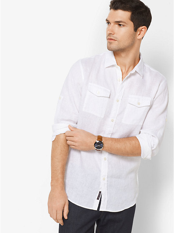 Stainless steel case with a brown (calfskin) leather strap. Fixed stainless steel bezel. Blue dial with silver-tone hands and index hour markers. Dial Type: Analog. Quartz movement. Scratch resistant mineral crystal. Pull / push crown. Solid case back. Case size: 44 mm. Case thickness: 9 mm. Round case shape. Band width: 22 mm. Tang clasp. Water resistant at 50 meters / 165 feet. Casual watch style. Michael Kors Slim Runway Blue Dial Men's Watch MK8508.
