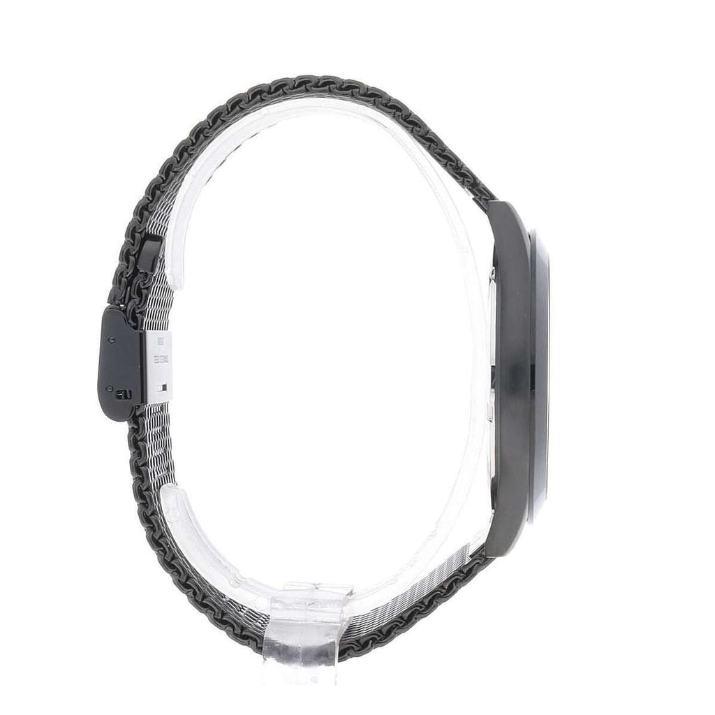 This men's Slim Runway watch features a black sunray dial with gold-tone stick indexes, black IP rounded case and mesh bracelet.