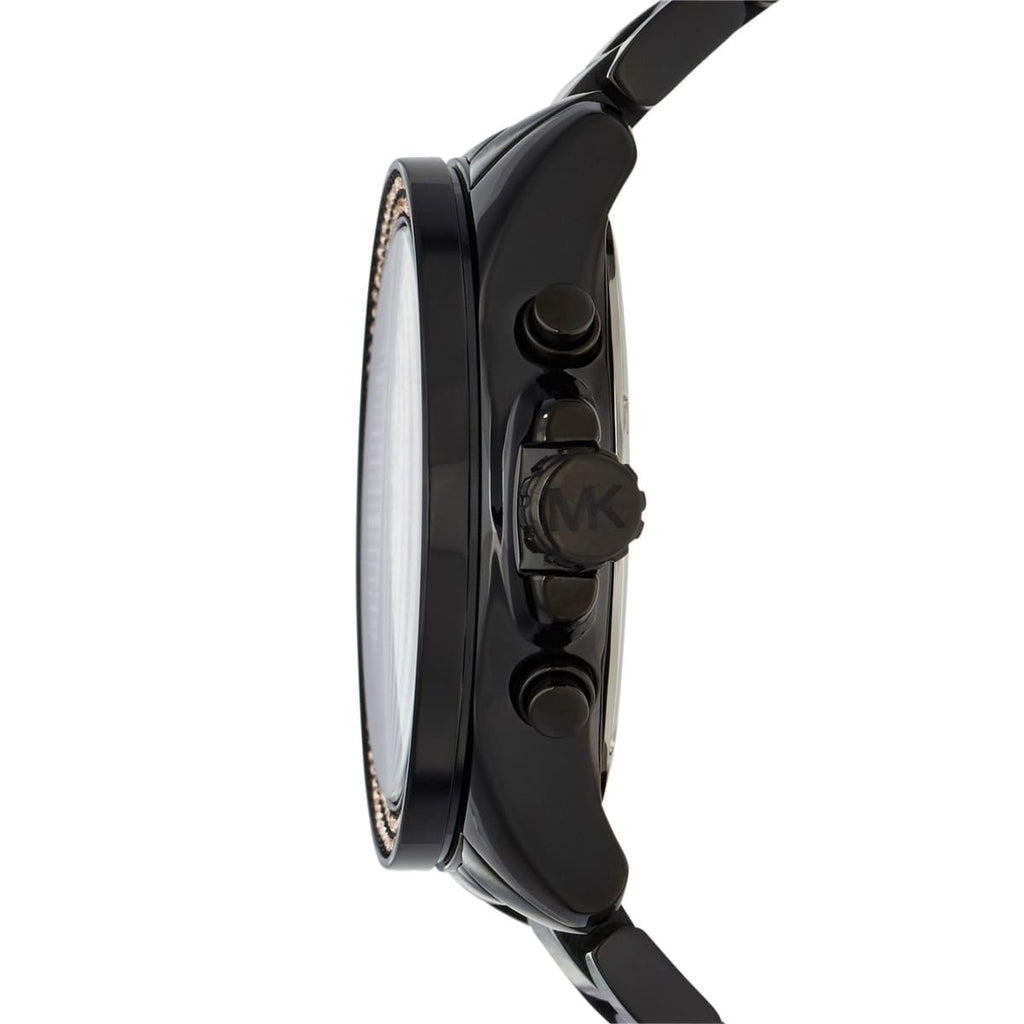 The Michael Kors Wren chronograph watch makes a chic, strong statement in black ion-plated stainless steel. The crystal-covered rose gold-tone dial and topring pop beautifully for a bold on-trend look.