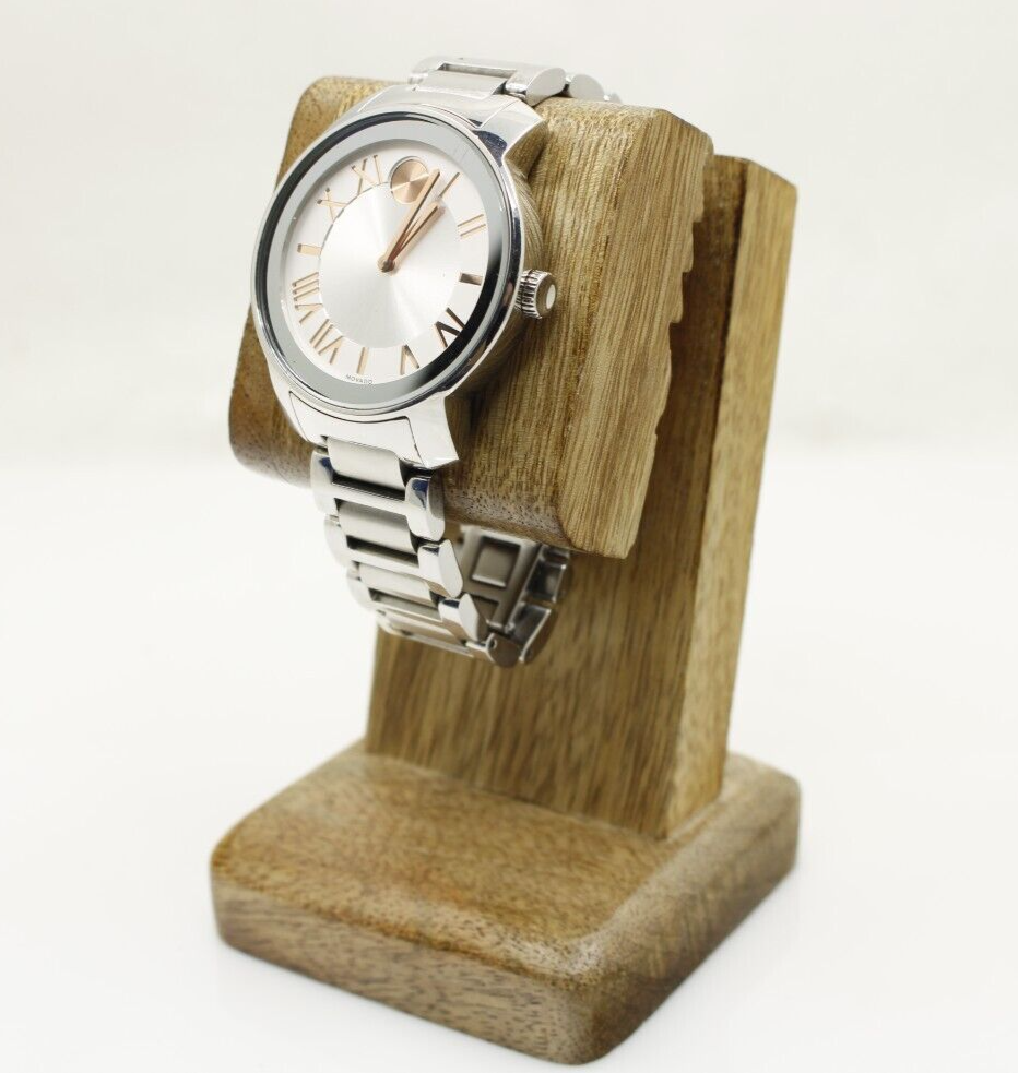 Stainless steel case with a stainless steel bracelet. Fixed stainless steel bezel. Silver dial with rose gold-tone hands and Roman numeral hour markers. The Movado dot marks the 12 o'clock position. Dial Type: Analog. Quartz movement. Scratch resistant K1 crystal. Pull / push crown. Solid case back. Case diameter: 32 mm. Round case shape. Deployment clasp. Water resistant at 30 meters / 100 feet. Functions: hour, minute. Sport watch style. Movado Bold Quartz Silver Dial Stainless Steel Ladies