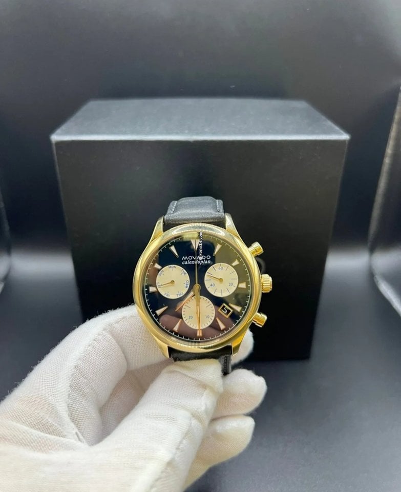 Men's Movado Heritage Series Calendoplan chronograph, 43 mm yellow gold ion-plated stainless steel case; round blue dial with luminescent gold-toned hands/applied markers, parchment-colored subdials (day/minute counter/small seconds), printed parchment minute index, date display; black leather strap with grey top-stitching and classic yellow gold ion-plated steel buckle.