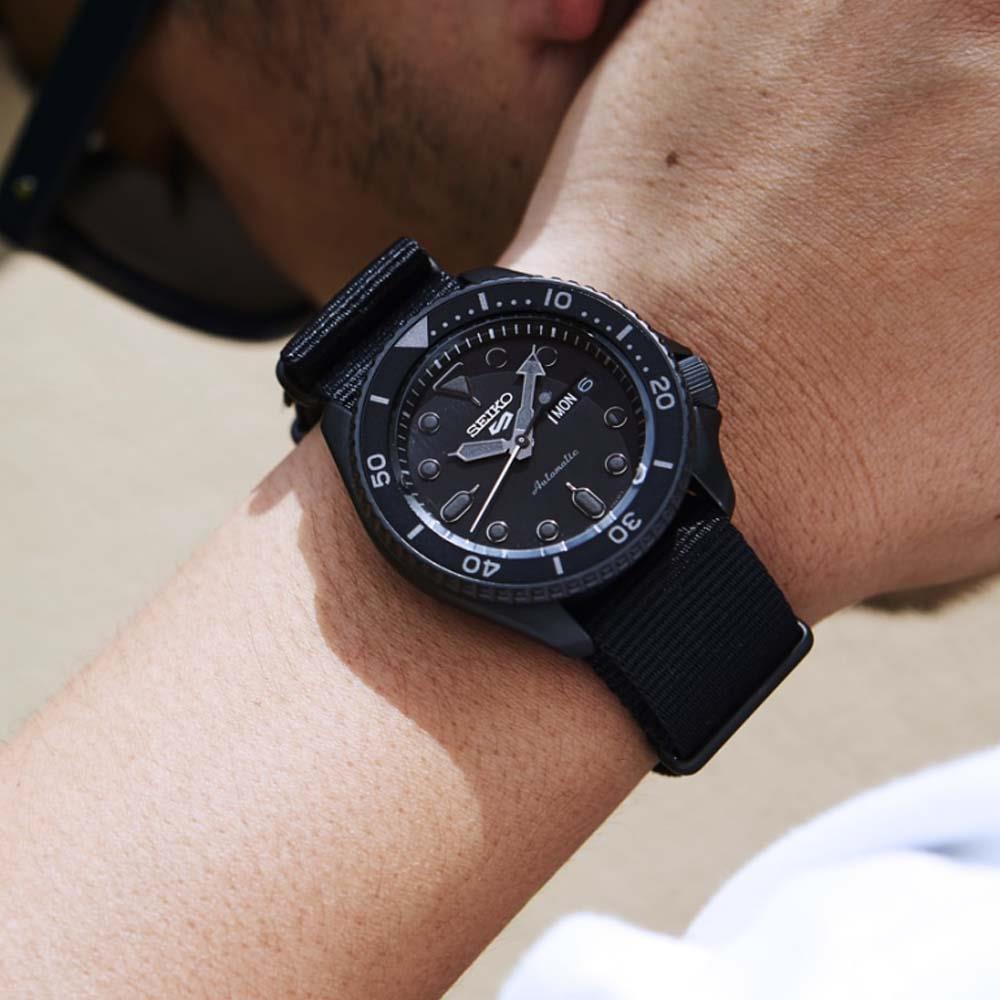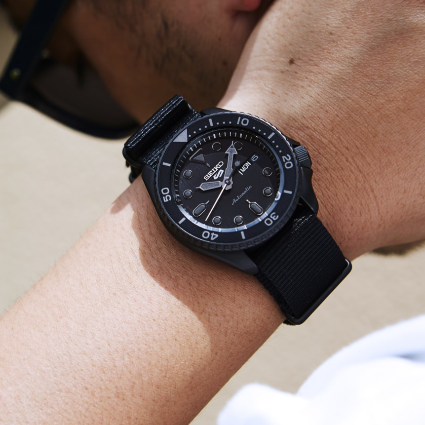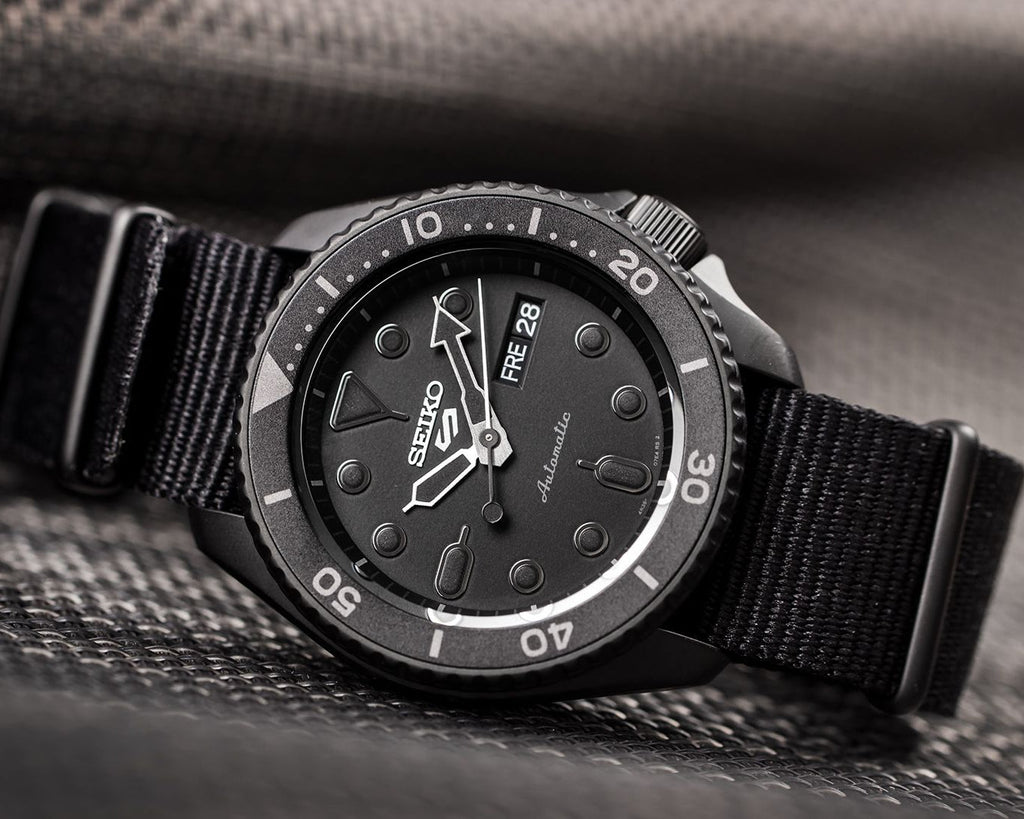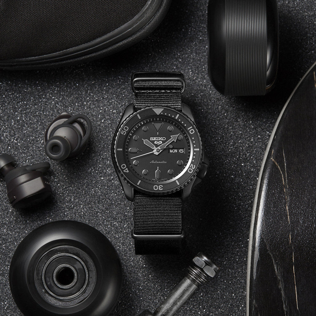 Totally black thanks to the titanium carbonate coating, this Seiko 5 Sports Street watch establishes an indomitable style. This automatic model comes from the desire to produce a casual, urban and sporty watch, but with a century-old manufacturing quality. You can admire the movement through the transparent case back, while the nato strap guarantees comfort that makes it optimal to wear even in the most extreme conditions.