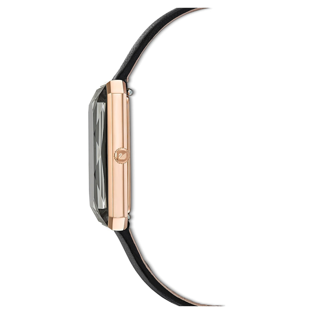 This watch by Swarovski is a great example of sophisticated design. It features a single, brilliantly faceted crystal in a rectangular shape, set into a rose-gold tone PVD coated case, while the black sunray dial is adorned with sparkling crystal index markers. A black genuine leather strap complements the dial beautifully. This Swiss Made watch adds a sophisticated yet casual touch to every occasion.
