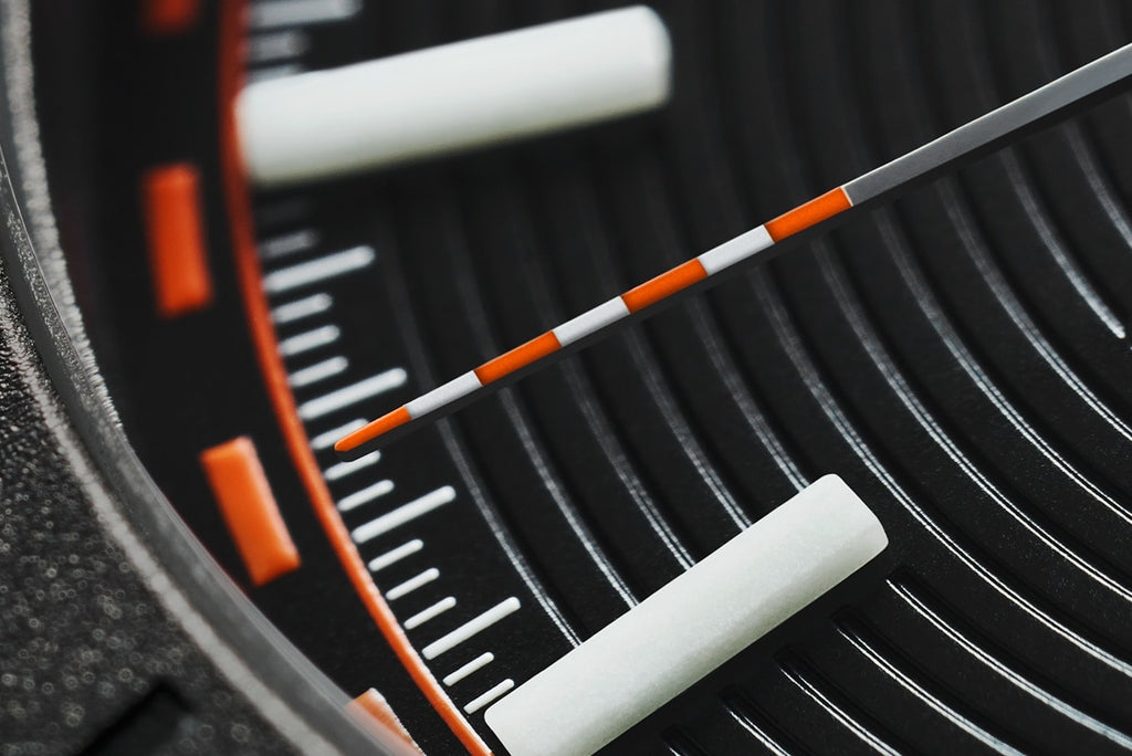 The black gold and orange color hands and the applied indexes are treated with white Super-LumiNova® for effortless reading in all lighting and at every depth.