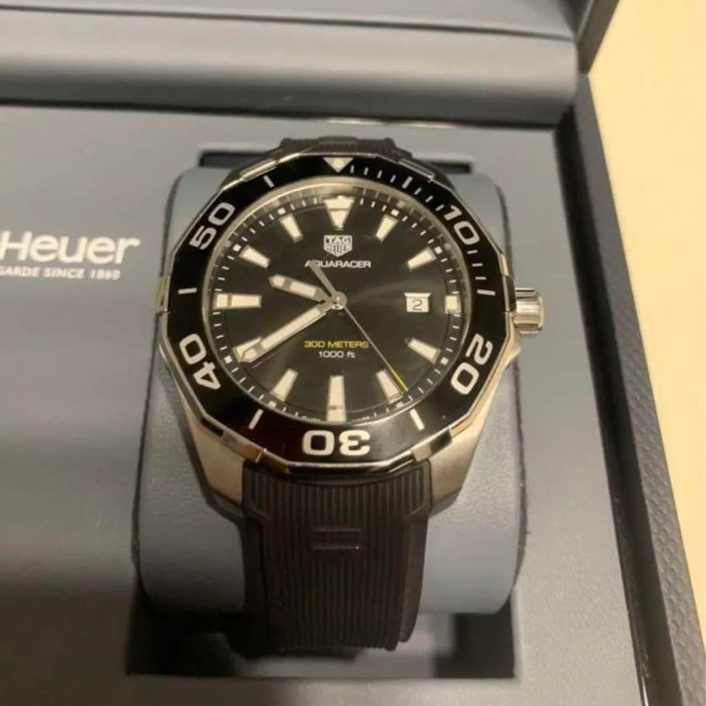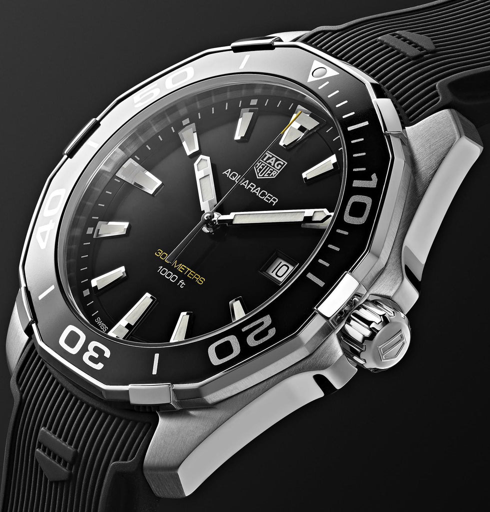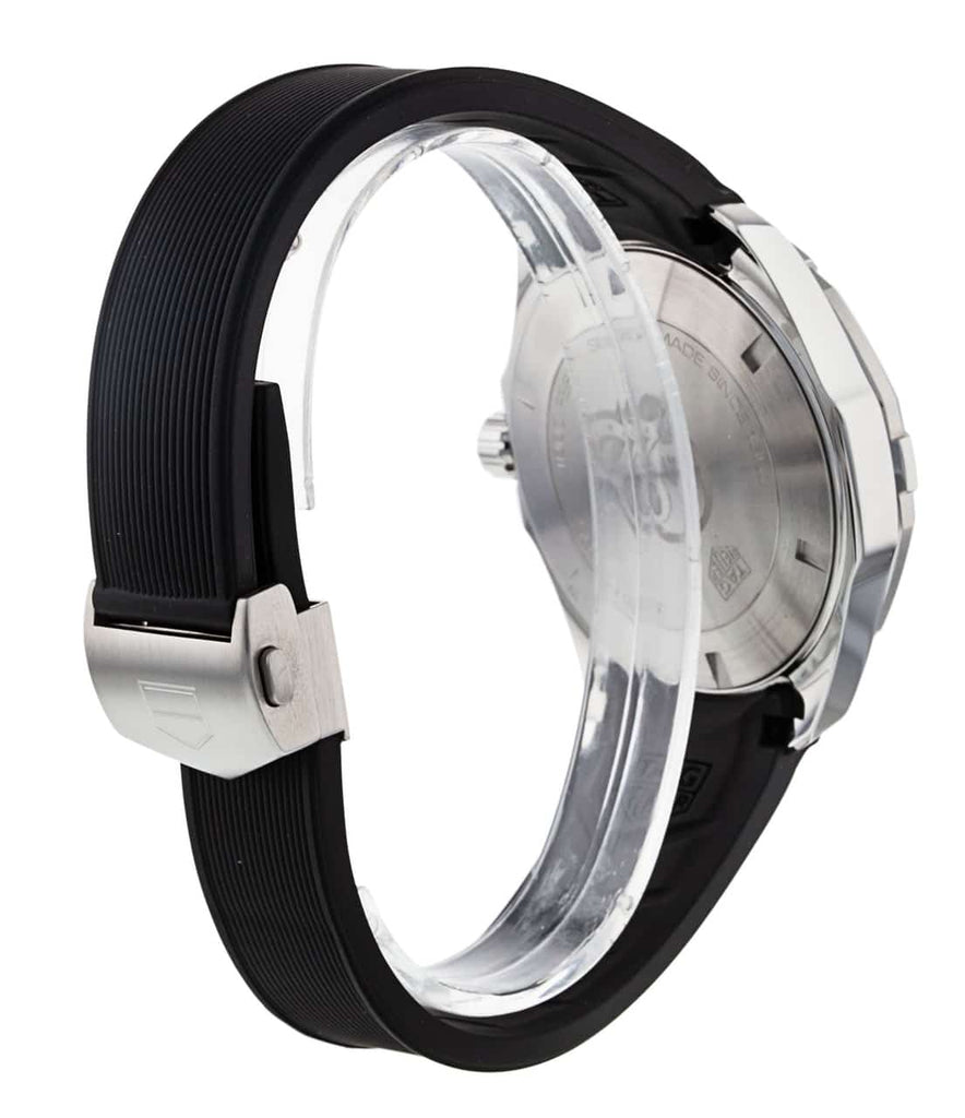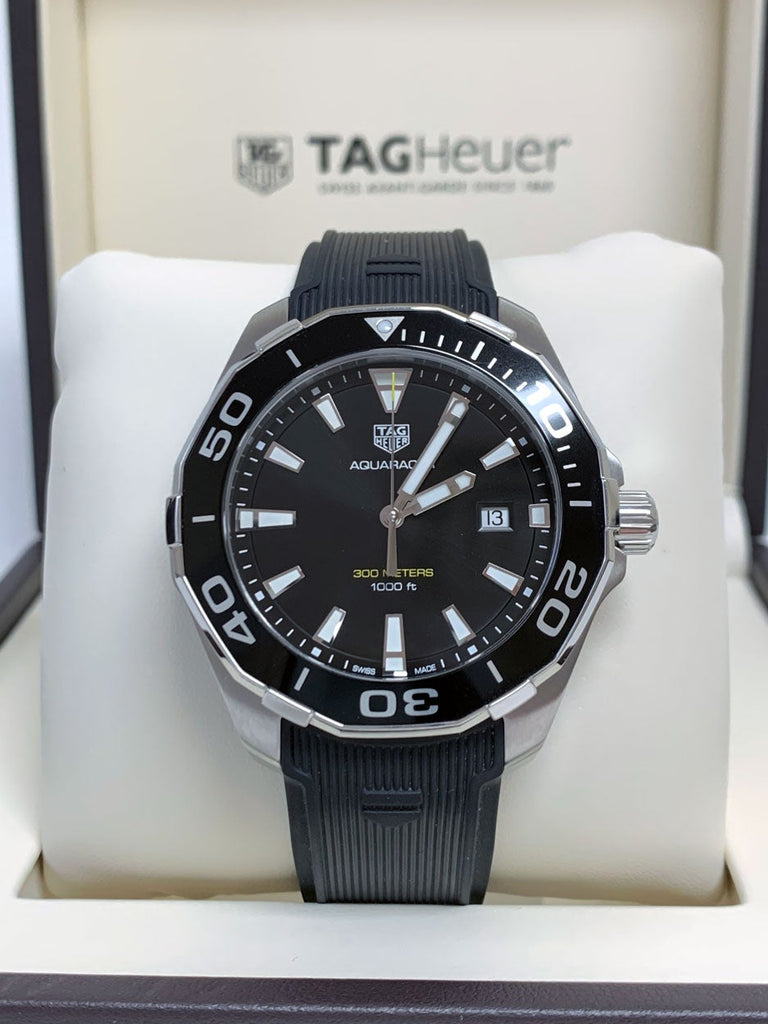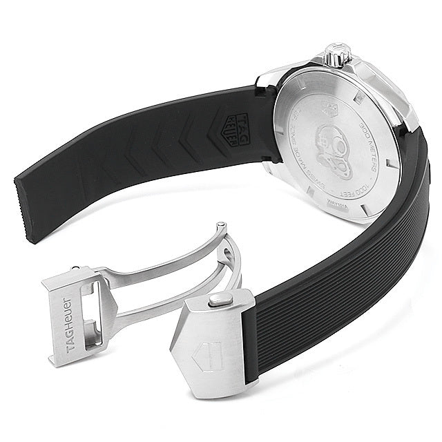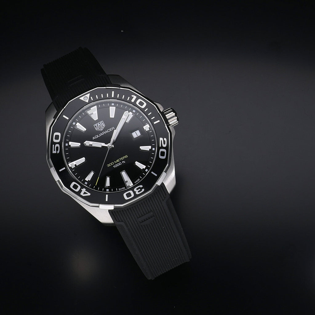 Featuring a Swiss quartz movement, this AQUARACER 300M men's watch from TAG Heuer showcases a black dial with a magnified date window surrounded by a black aluminum unidirectional turning bezel in a 43mm stainless steel case. Antireflective treatment on the scratch-resistant sapphire crystal improves visibility, along with luminous markers and hands. The black rubber strap secures with a push-button fold-over clasp with a diving extension. The watch is water-resistant to 300 meters. The black rubber strap secures with a push-button fold-over clasp with a diving extension. The watch is water-resistant to 300 meters.