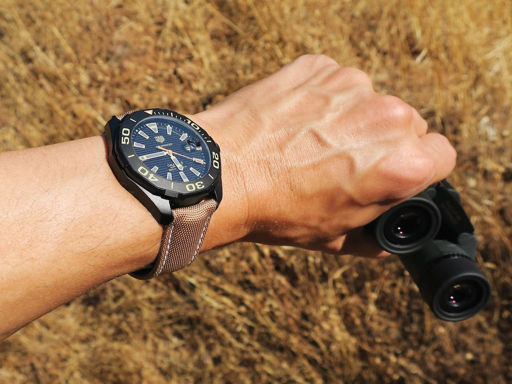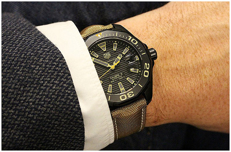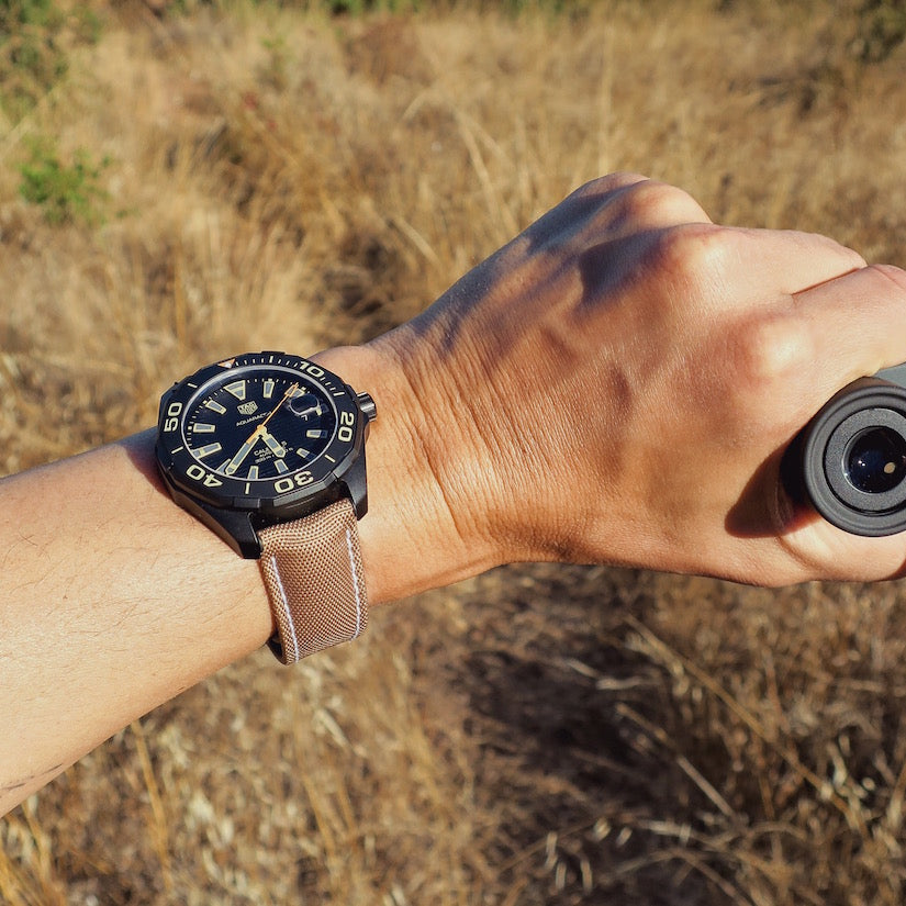 titanium case, with a black dial. Beige synthetic Strap. automatic movement. sapphire crystal. 43mmx 43mmx 9mm case. 22mm band width. 300 meters water resistant. Tag Heuer Aquaracer Automatic Beige Synthetic Watch WAY208C.FC6383