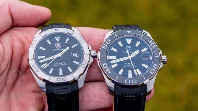 Tag Heuer Aquaracer Calibre 5 has a Silver-tone stainless steel case with a silver-tone stainless steel bracelet. Uni-directional rotating black ceramic bezel. Black dial with luminous silver-tone hands and index hour markers. Minute markers around the outer rim. Dial Type: Analog. Luminescent hands and markers. Date display at the 3 o’clock position. TAG Heuer Calibre 5 Automatic movement, based upon ETA 2824-2, containing 26 Jewels, bitting at 28800 vph, and has a power reserve of approximately 38 hours. Scratch resistant sapphire crystal.