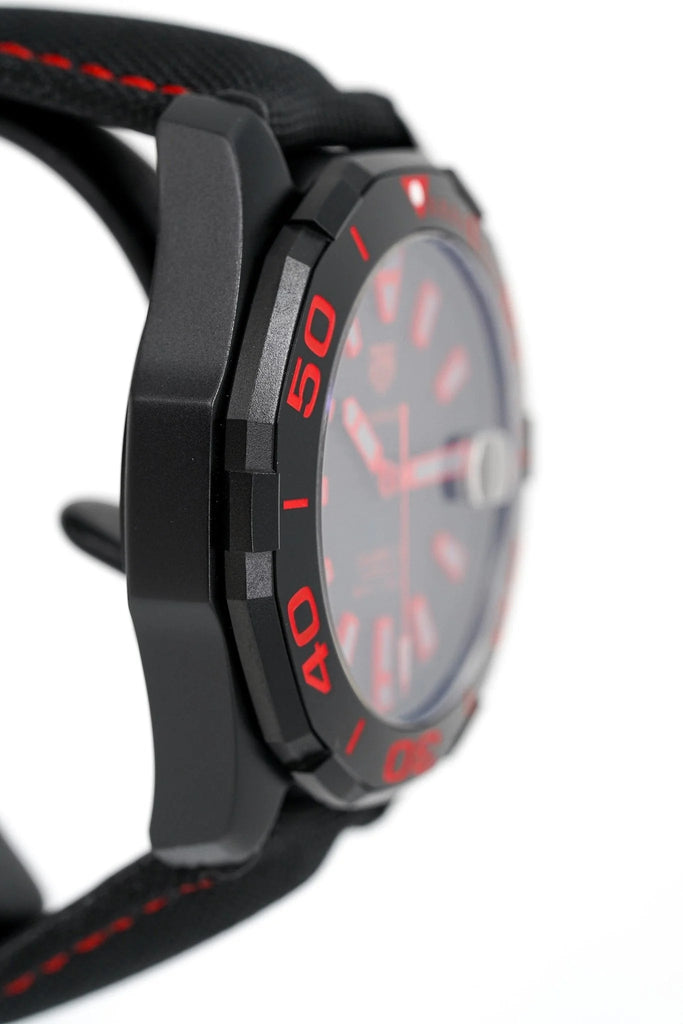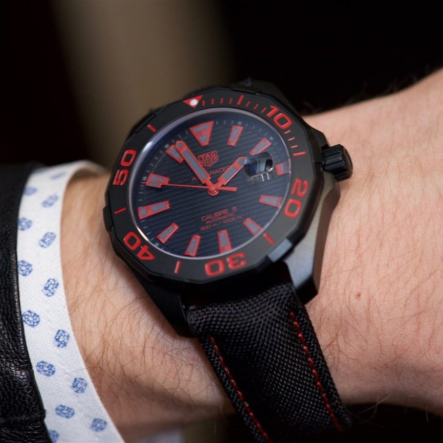 Tag Heuer Aquaracer Automatic Men's Watch WAY208A.FC6381. This 43mm sport watch features a black titanium carbide coated titanium case, black nylon fabric strap and a black ceramic rotating bezel with a 60-minute scale. The black dial has luminescent hands and hour markers with a date window displayed at 3 o'clock and a horizontal streak effect. It is powered by the Tag Heuer Caliber 5 self-winding automatic movement with a 38-hour power reserve.