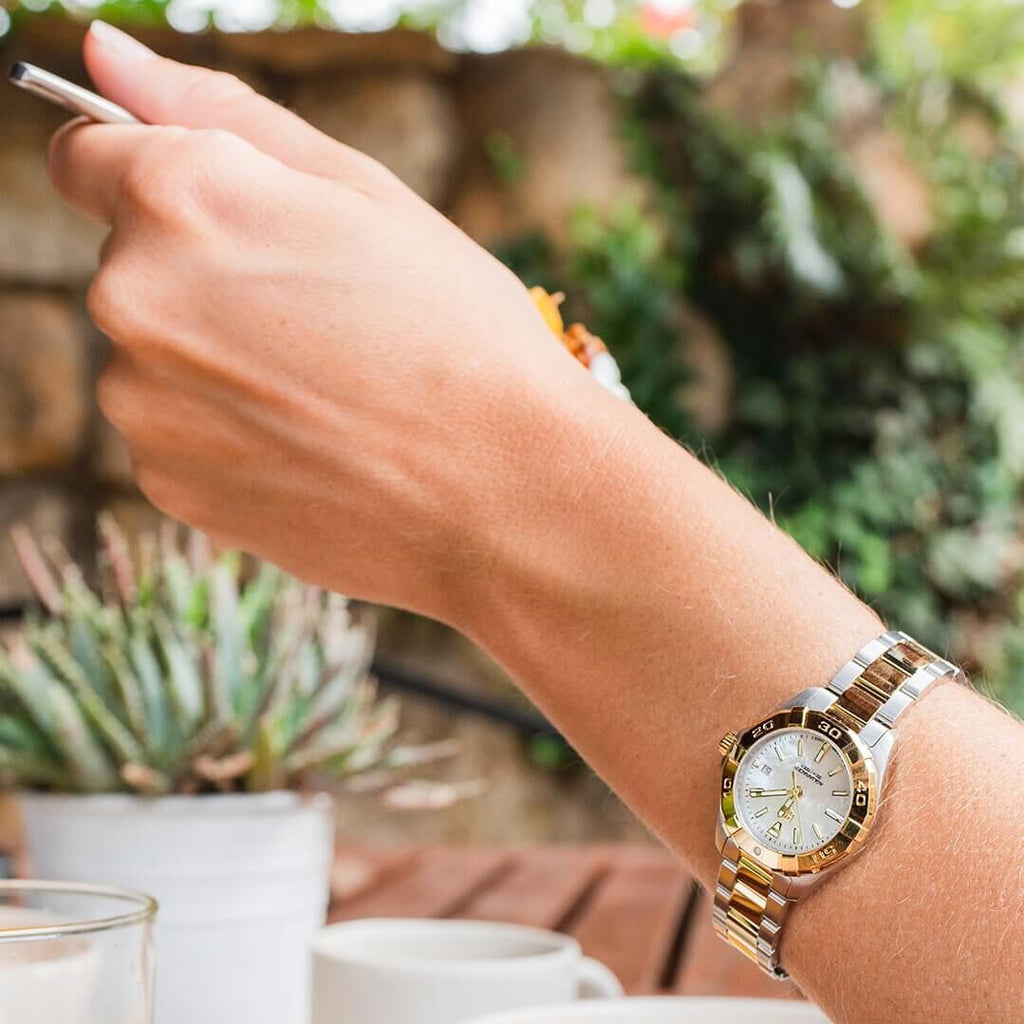 The TAG Heuer Aquaracer Quartz Ladies Mother of Pearl Steel & Yellow Gold Coating Watch has a stainless steel case. The rotating bezel has a gold coating and is set with 35 diamonds. The white mother-of-pearl dial perfectly complements the gold finish of the hands and hour markers. The watch is equipped with a Swiss Quartz movement, which is powered by batteries.