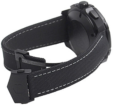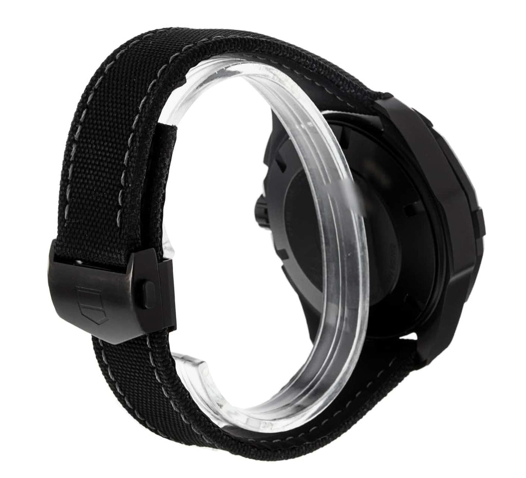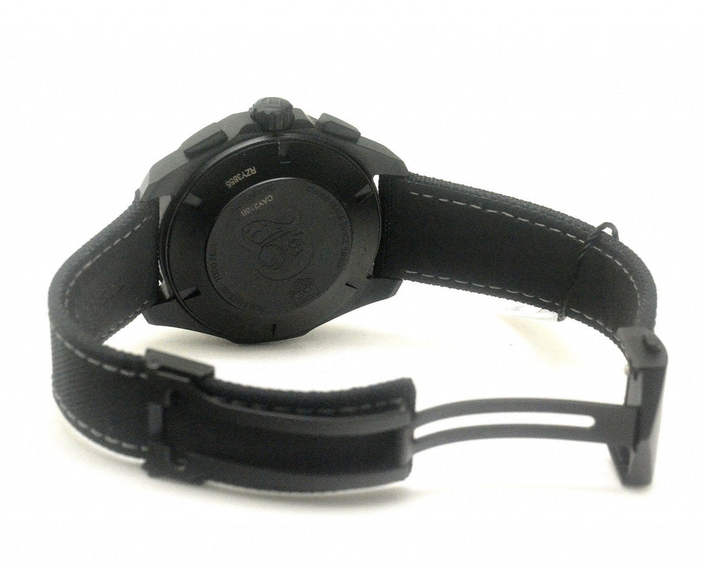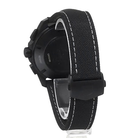 Black DLC titanium case with a black fabric strap. Uni-directional rotating black ceramic bezel. Black dial with luminous grey hands and index hour markers. Minute markers around the outer rim. Luminescent hands and markers. Date display at the 3 o'clock position. Chronograph - three sub-dials displaying: 60 second, 30 minute and 12 hour.