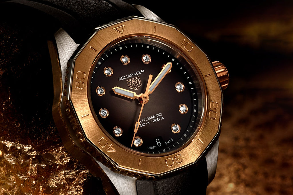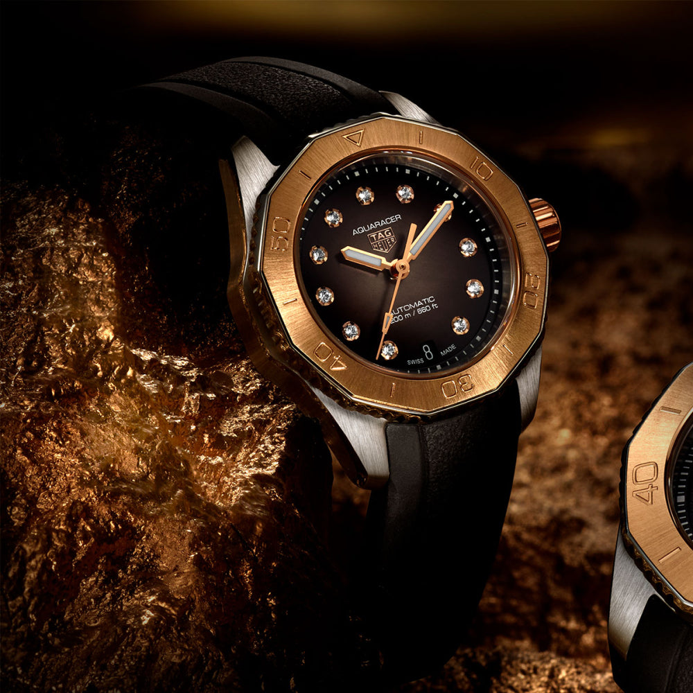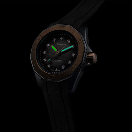 Elegance shines through every detail of this superior TAG Heuer Aquaracer, where 18K 5N solid rose gold and shimmering VS 1.4mm-diametre diamonds (0.107 ct) have pride of place. With its smoky-black dial and matching resilient rubber strap, it is set to go further than ever.