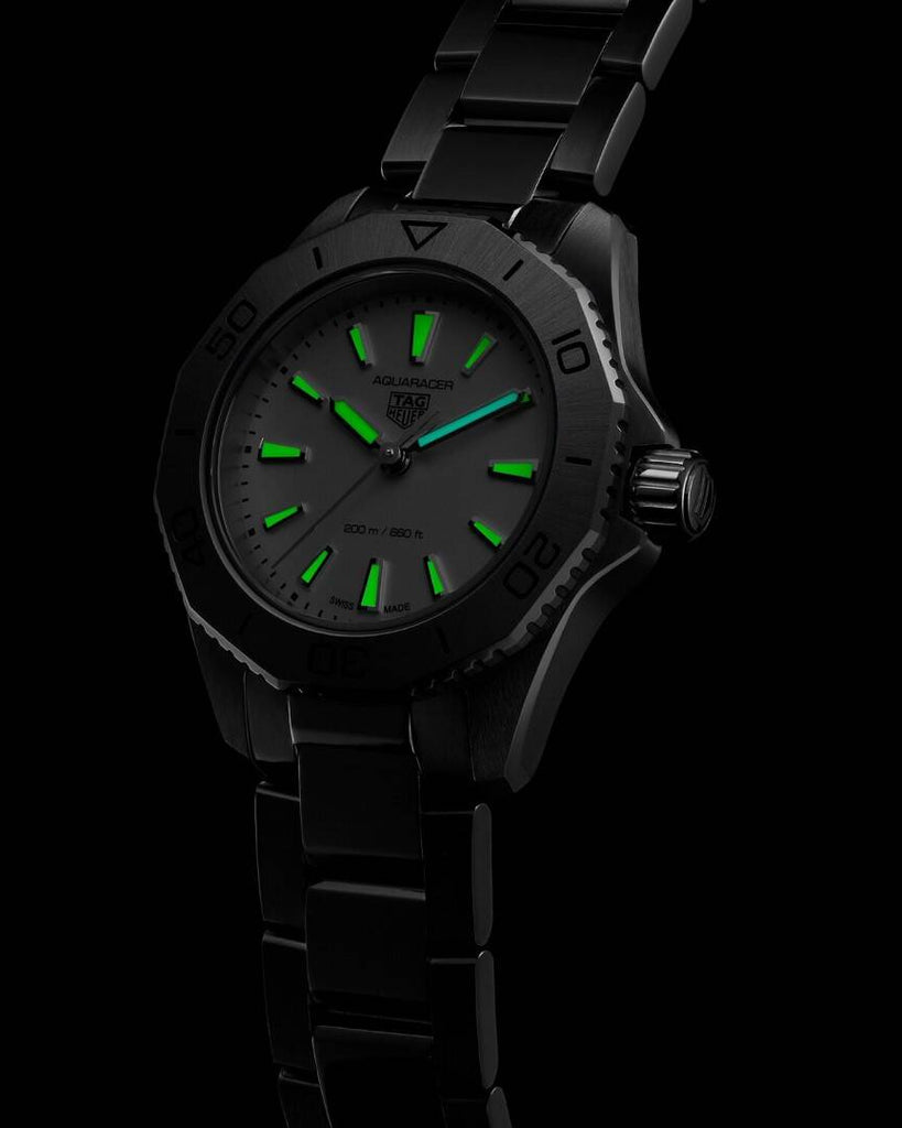 The silver sunray brushed dial of this TAG Heuer Aquaracer blends boldness and performance perfectly, with hands and indexes filled with Super-LumiNova®.