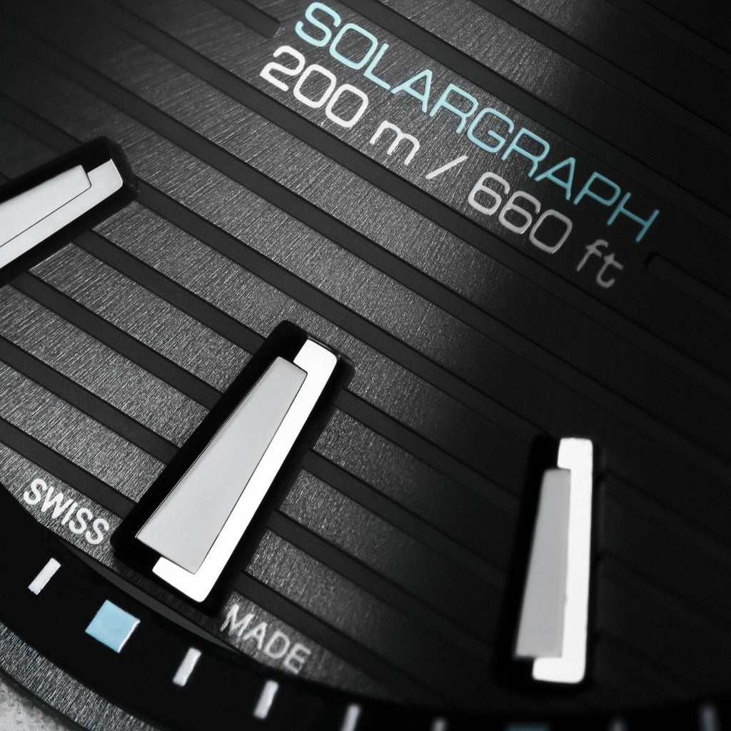 - Black tinted semi-translucent dial with vertical lines & a fine sunray finish. The solar panel is mounted under the dial.