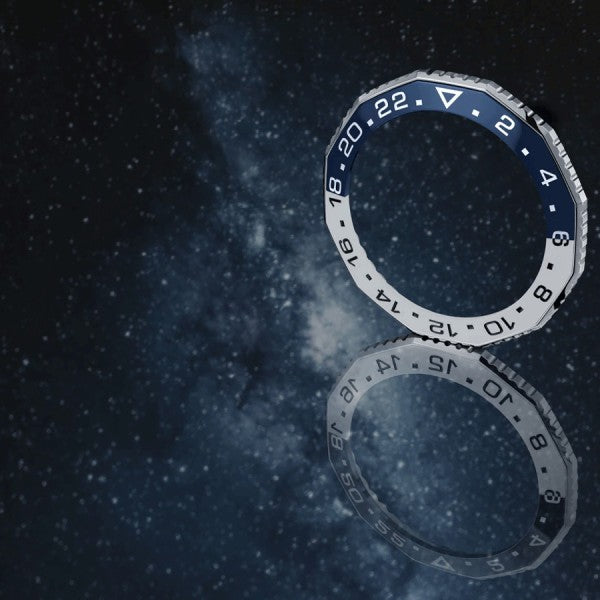 - Blue & white ceramic bezel ring with 24 hour indications.