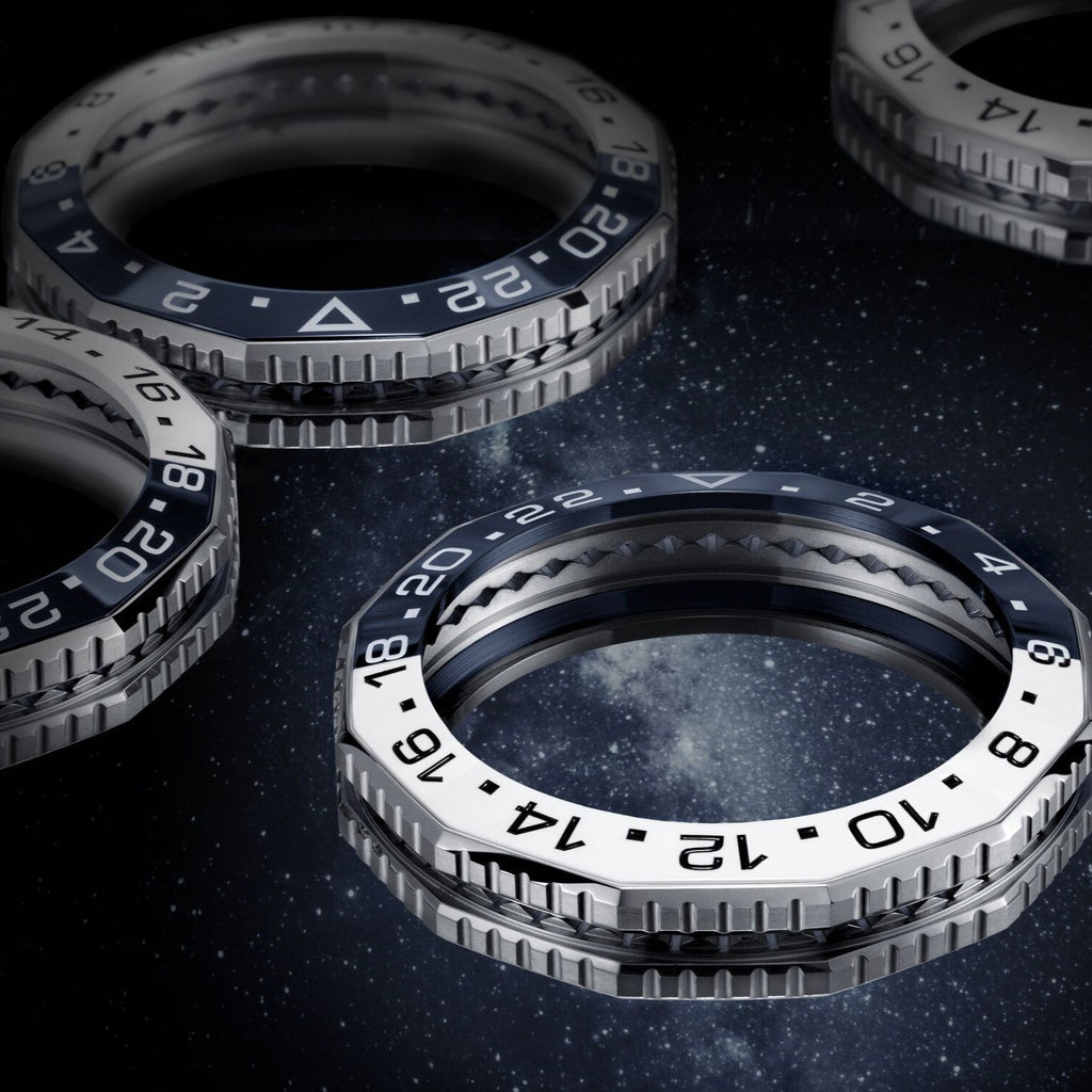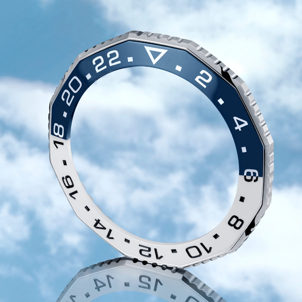 - Blue & white ceramic bezel ring with 24 hour indications.