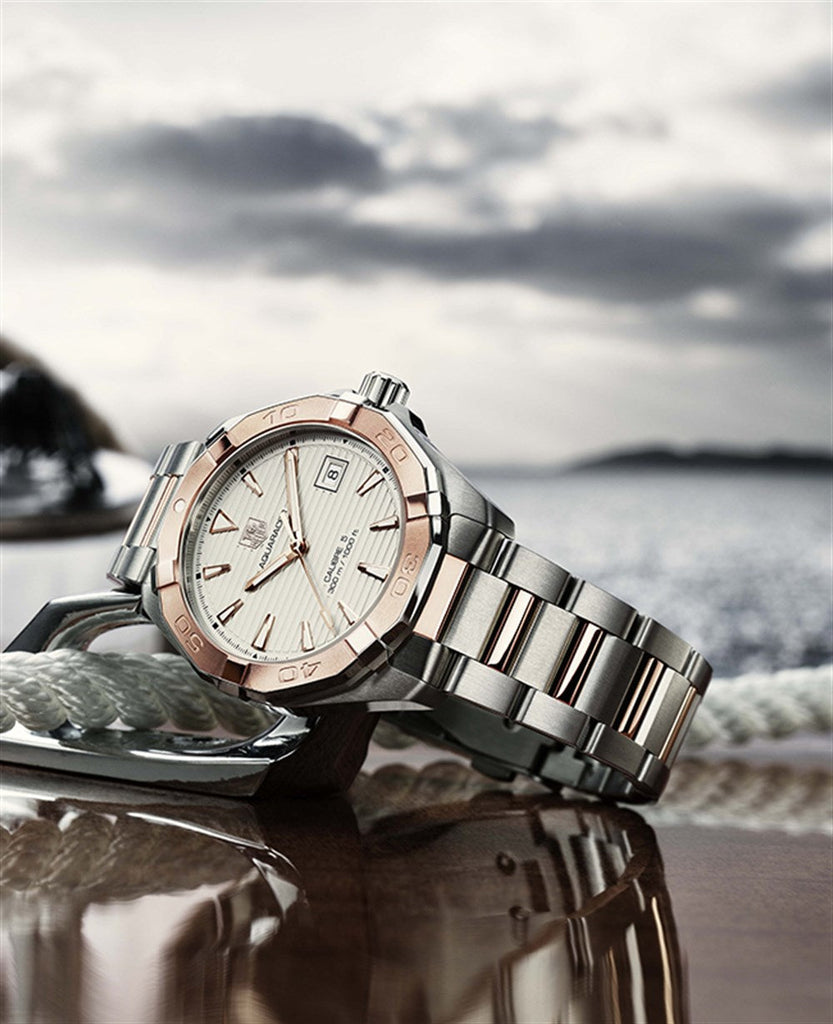 Swiss-made, this bold TAG Heuer Aquaracer is an aesthetic 41 mm watch. This model features a Steel and Gold case and a Calibre 5 Automatic movement.