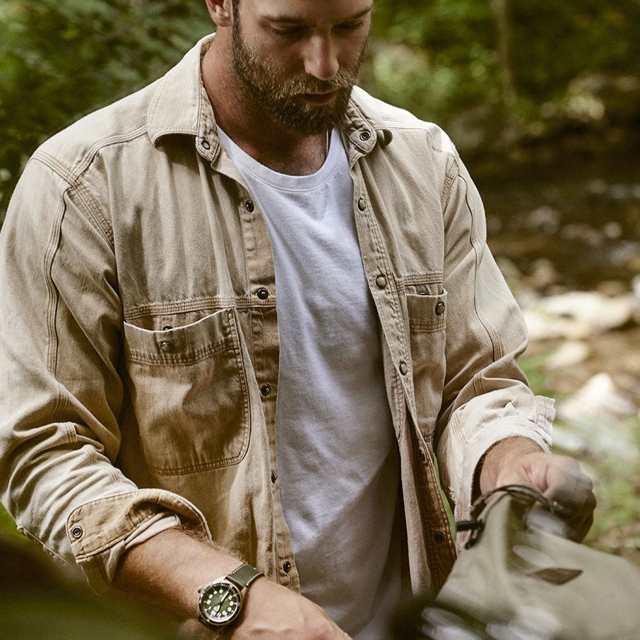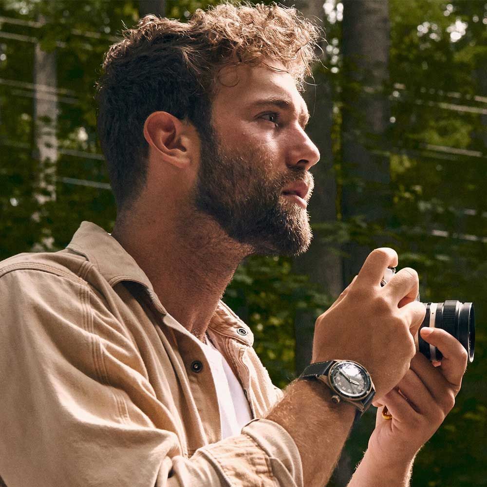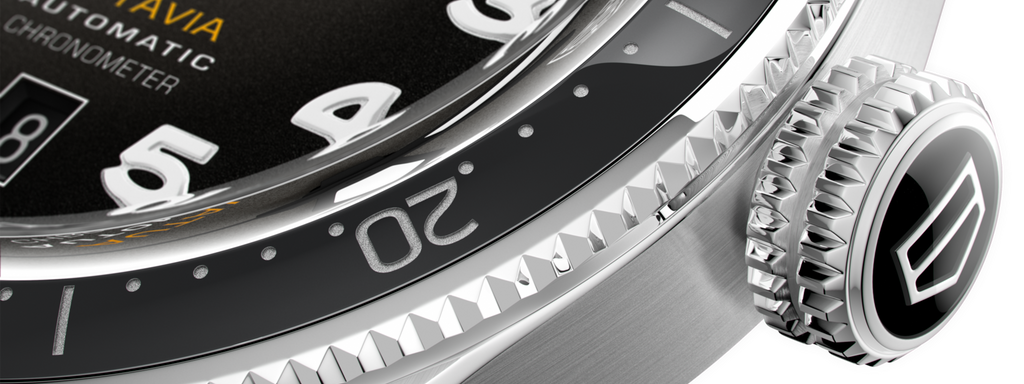 The oversized crown, Arabic numerals and sword-shaped hands take inspiration from Heuer pilot watches and timers from 1933 to 1957. The dial is smoked brown, the ceramic 60-minute bezel rotates bi-directionally. The rounded stainless-steel case and beveled lugs echo those of the Autavia from the 1960s.