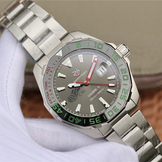 This 43mm sport watch features a stainless steel case, bracelet, and a black ceramic rotating bezel with a 60-minute scale. The black dial has luminescent hands and hour markers with a date window displayed at 3 o’clock. It is powered by the Tag Heuer Caliber 5 self-winding automatic movement with a 38-hour power reserve.