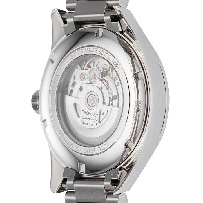 Stainless steel case with a stainless steel bracelet. Fixed stainless steel bezel. Blue dial with luminous silver-tone hands and index hour markers. Minute markers around the outer rim. Dial Type: Analog. Luminescent hands and markers. Day of the week and date display at the 3 o’clock position. TAG Heuer calibre 5 automatic movement.