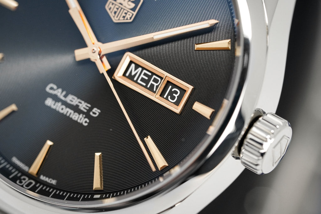 The 41mm day-date model displays the refined the TAG Heuer Carrera styling to perfection. The contrast of black dial and rose gold-plated hands, indexes, logo and Day-Date window is impactful and alluring.