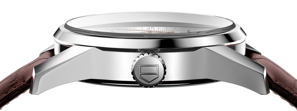 The white dial is the perfect foil for the burnished glow of the rose-gold second hand, indexes, hour and minute hands, TAG Heuer logo and Day-Date window at 3 o’clock.