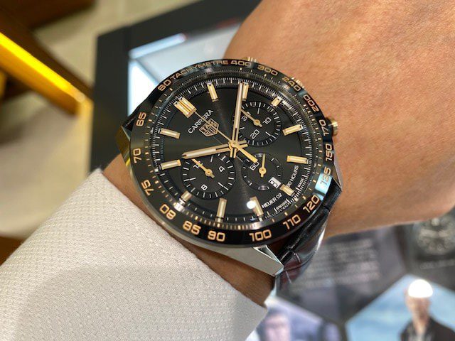 The black brushed dial sits under a sapphire crystal dome, locked in with a ceramic black tachymeter fixed bezel. Inside, our manufacture Heuer 02 movement made with a vertical clutch and column wheel – signatures of improved chronograph timekeeping and high-quality manufacture movements – will last 80 hours with an impressive power reserve.