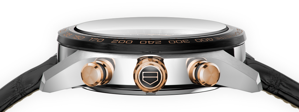 In sumptuously chic black and rose gold, this Carrera sets a blistering new pace in prestige timekeeping. Housed in a 44-mm steel polished, fine brushed case, the legendary Calibre HEUER02 Automatic movement now comes outfitted with splendid finery.