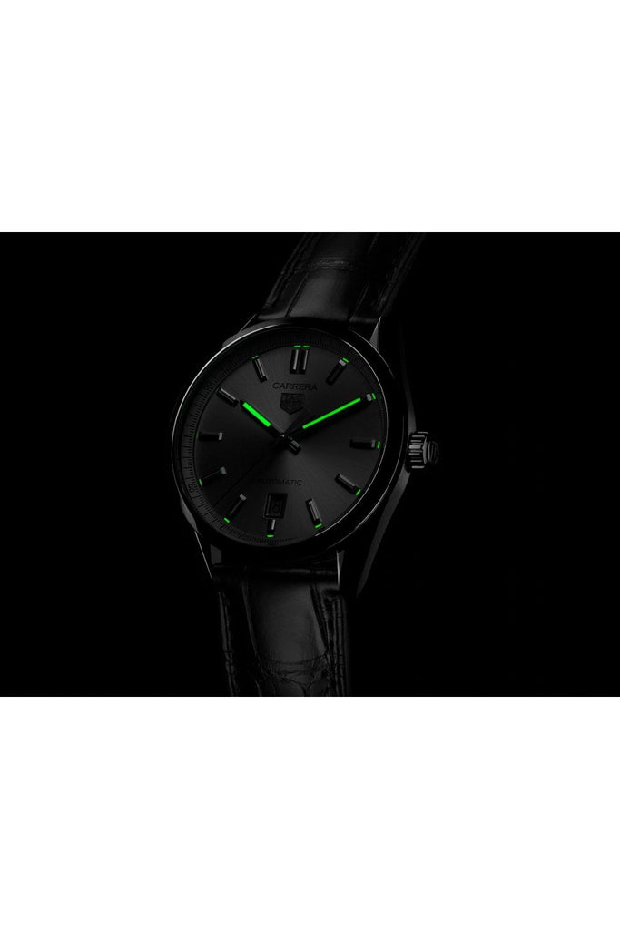 An iconic signature design, the TAG Heuer Carerra blends precision timekeeping with distinctive looks. The indulgent and showy silver sunray brushed dial is complemented by rhodium plated hands, hour markers, and an applied TAG Heuer shield.