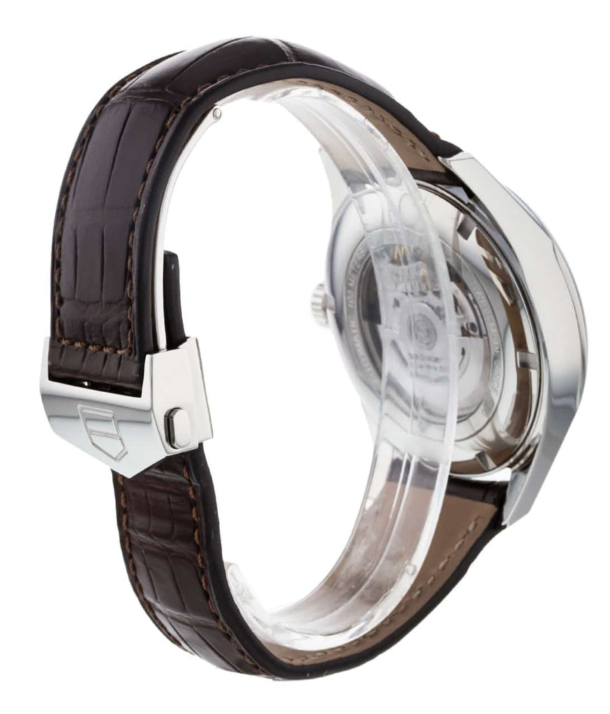 Brand New Authentic Tag Heuer Carrera Calibre 5 Day-Date Automatic Silver Dial Crocodile Strap Men's Watch Model WAR201B.FC6291. Polished Stainless Steel case with Brown Alligator Leather strap. Deployment clasp. Dial description: Silver with Day-Date at 3 dial. Silver dial. Automatic Self Winding Winding Calibre 5 with Approx. 38Hr. Power Reserve movement. Winding crown. Scratch Resistant Sapphire crystal. Case size: 41mm. Transparent case back. 100 Meters/330 Feet water resistant. 2 year warranty. Also known as model: WAR201BFC6291, WAR201B-FC6291.
