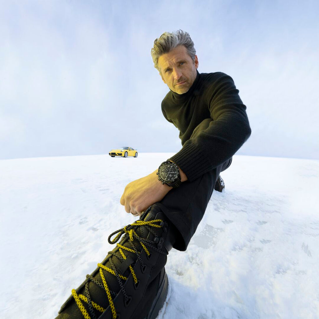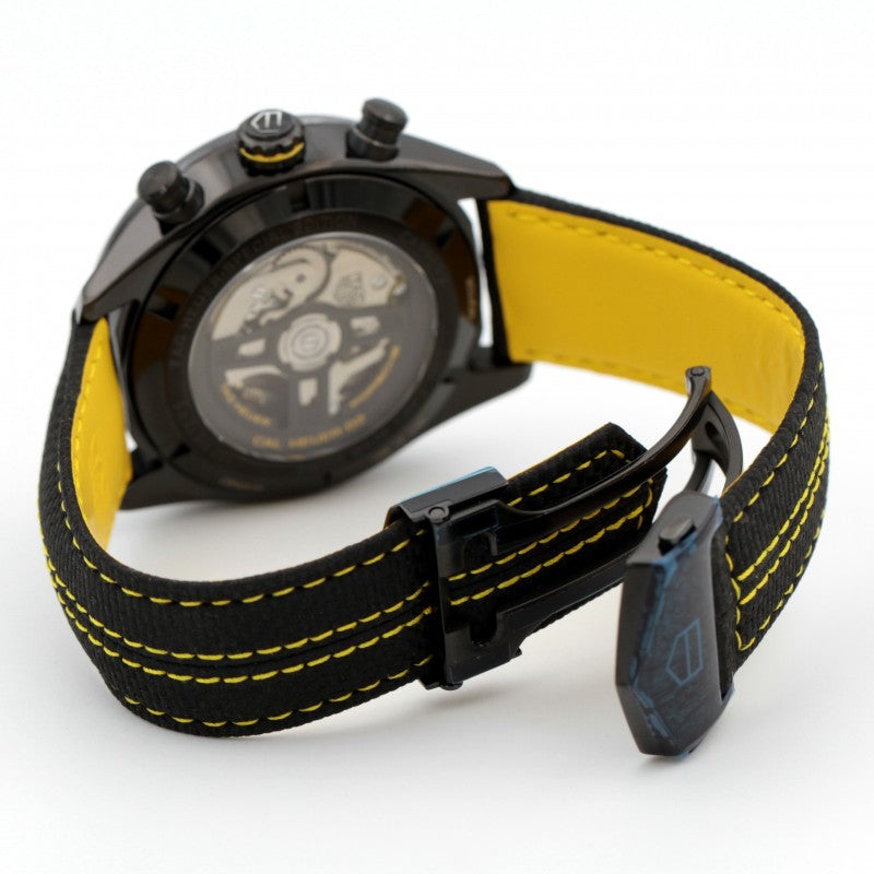 A tribute to Porsche's interiors, a textured calf leather strap with bold yellow stitching and lining. A black DLC steel folding clasp matches the case.