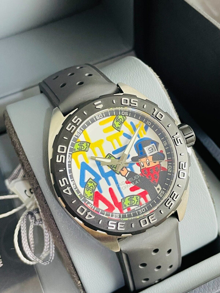 A black PVD brushed unidirectional bezel has a 60-minute scale in silver. The sapphire crystal sits above the colourful dial. An outer 60-minute track is printed in white numerals. Alec has used the monopoly money randomly placed on the dial alongside Mr. Monopoly and his masked persona. Dripping Alec in yellow, blue, and red paint across the dial. Long flat-ended dauphine hands with luminescent tips complemented by a tapered second hand. Text at 6 o’clock printed in silver. At 3 o’clock, a date window. On the reverse, a screw-down case back with Alec Monopoly signature engraved into it. Inside a Swiss Quartz movement. The watch comes fitted on its 20mm Tag Heuer rubber strap with a signed buckle. Comes with its Tag Heuer presentation box and papers.