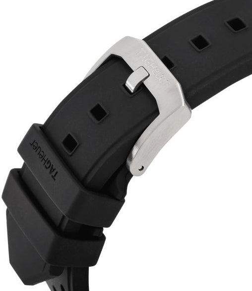 stainless steel case, with a black dial. Black rubber Strap. quartz movement. sapphire crystal. 43mmx 43mmx 12mm case. 21mm band width. 200 meters water resistant. Tag Heuer Formula 1 Quartz Chronograph Black Rubber Watch CAZ1011.FT8024