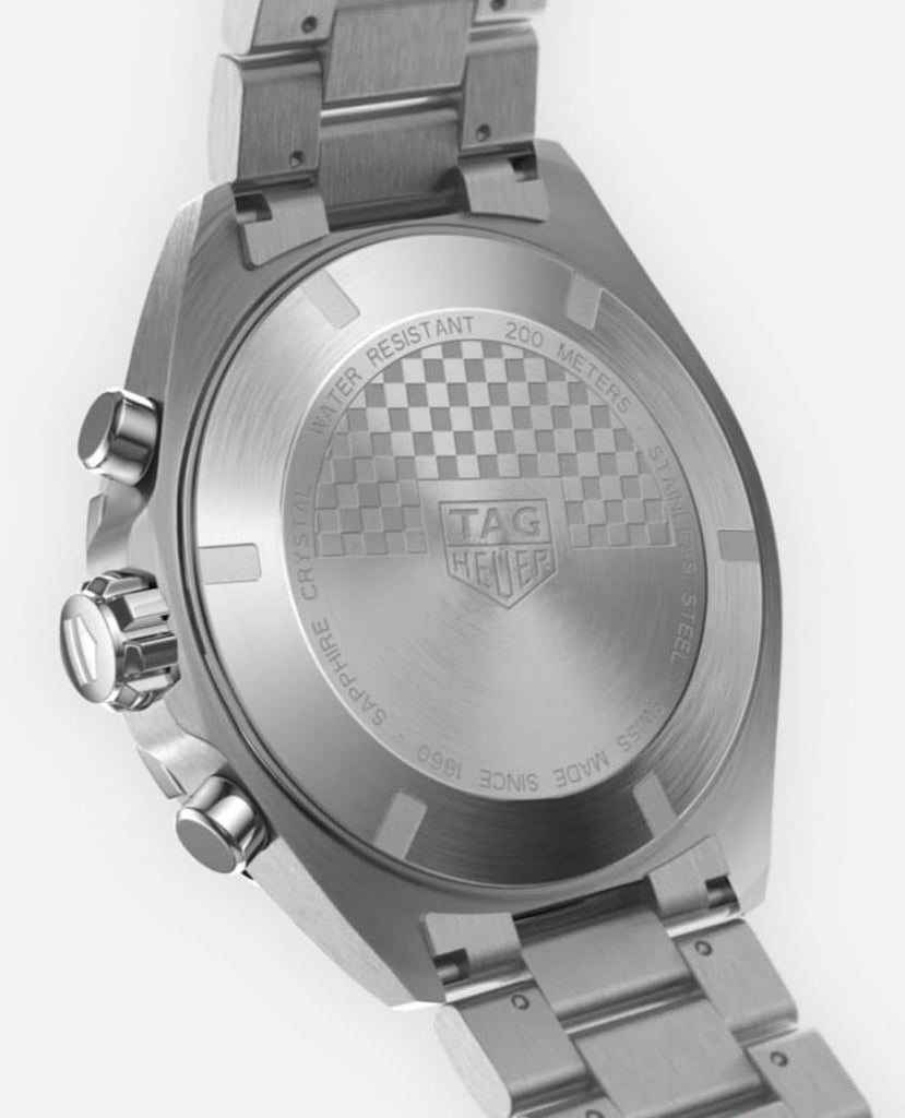 Designed to outpace and outlast, this racer’s timepiece is equipped with steel screw-down crown and case back, and water resistance to 200 meters.