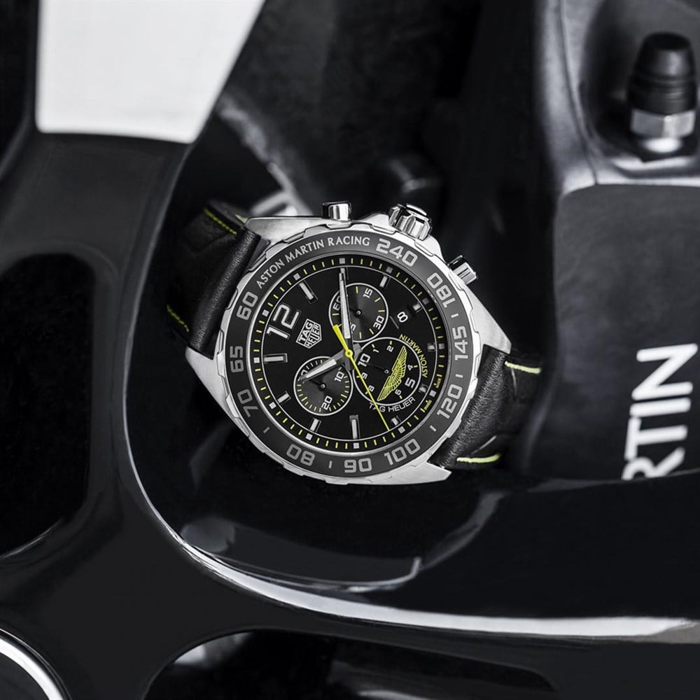 The indexes, seconds hand and Aston Martin's famous winged logo are in the racing team’s signature lime green, sharply contrasted with the all-black dial. The magnificent black leather strap topstitched in the racing legend’s iconic shade of lime green.