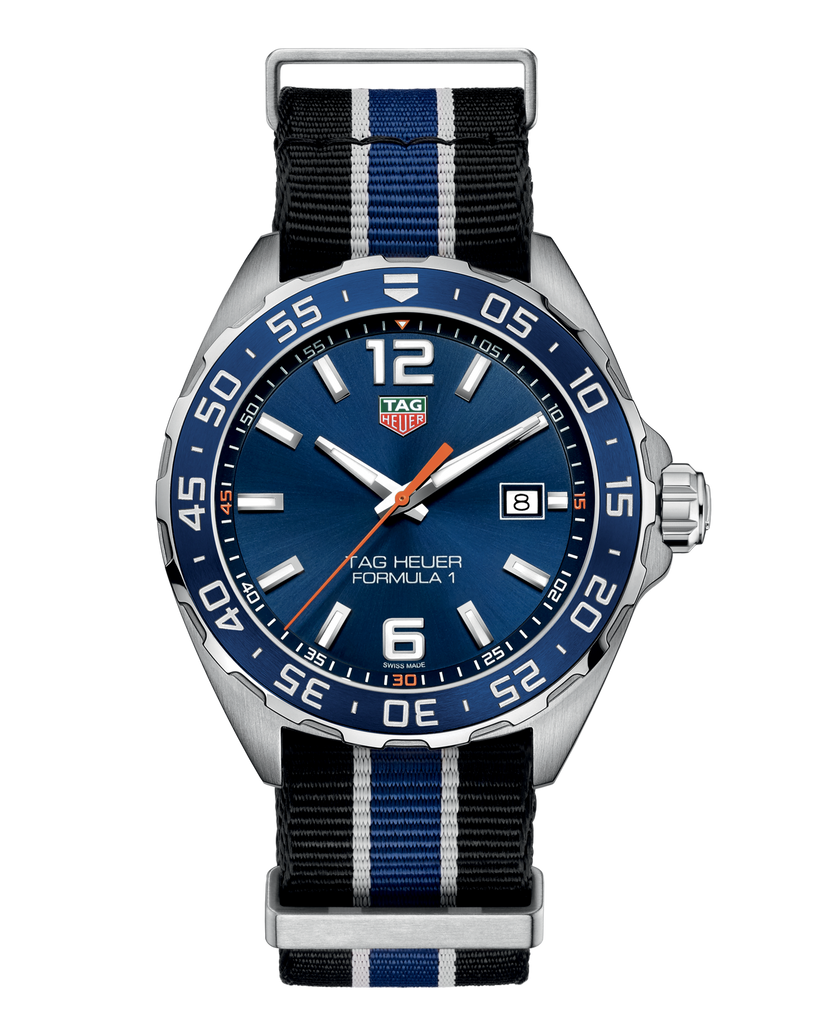 Stainless steel case with a two tone nylon strap. Blue dial with luminous silver tone hands and index hour markers. Arabic numerals mark the 6 and 12 o'clock positions. Minute markers around the rim. Analog dial. Date window at the 3 o'clock position. Quartz movement. Scratch resistant sapphire crystal. Screw down crown. Case size: 43 mm. Case thickness of 12 mm. Band width: 21 mm. Tang clasp. Water resistant up to 200 meters. Sports watch. Formula 1 series.