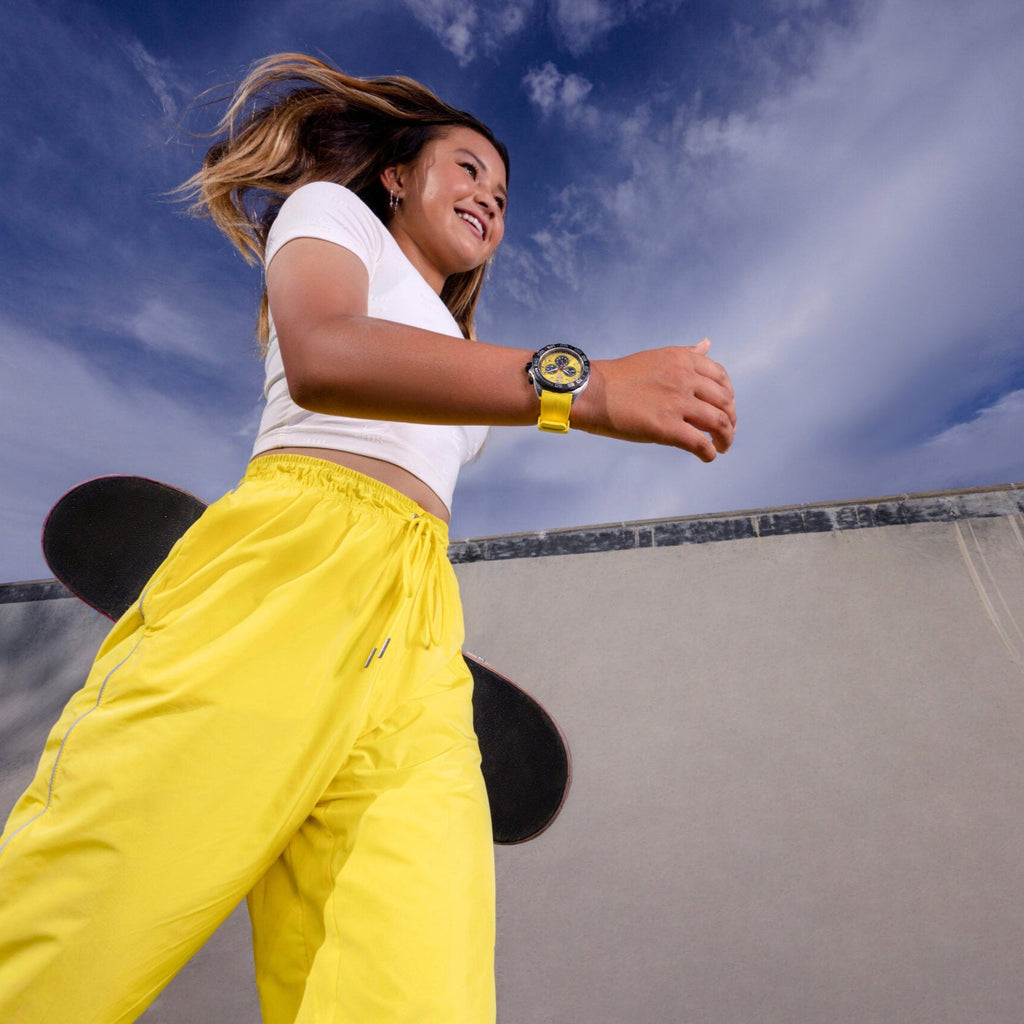 Stand out with a bold yellow sunray brushed dial and high-quality yellow rubber strap. Perfect for a sportive look and an unmissable statement.