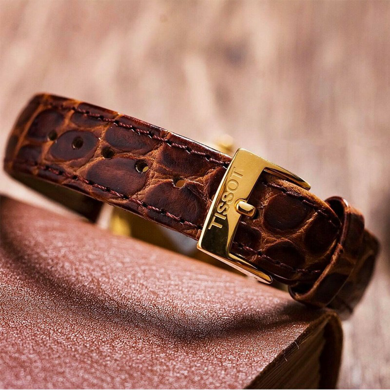 Yellow gold PVD stainless steel case with a brown (croco-embossed) leather strap. Fixed yellow gold PVD bezel. White dial with yellow gold-tone hands and index hour markers. Minute markers around the outer rim. Dial Type: Analog. ETA Caliber 902.101 quartz movement. Scratch resistant sapphire crystal. Pull / push crown. Solid case back. Case size: 30 mm. Case thickness: 6.15 mm. Round case shape. Band width: 15 mm. Tang clasp. Water resistant at 30 meters / 100 feet. Functions: hour, minute, second. Dress watch style. Watch label: Swiss Made. Tissot Everytime White Dial Ladies Watch T109.210.36.031.00.