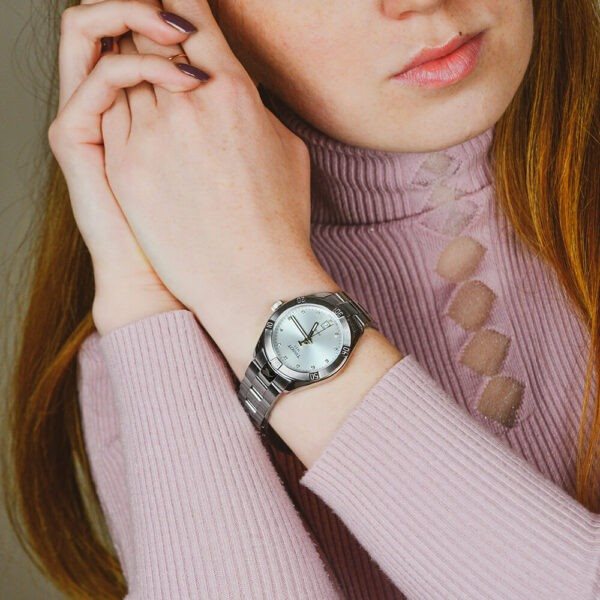 36mm stainless steel case, silver dial with diamond hour markers. Quartz movement, sapphire crystal glass and water resistant to 100m. Presented on a stainless steel bracelet.