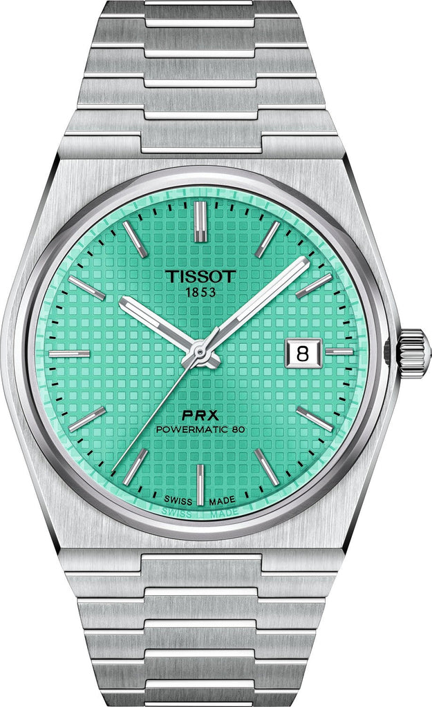 Discover timeless elegance with the Tissot PRX Powermatic 80 Automatic Watch. Featuring a striking mint green dial and a durable silver steel strap, this watch elevates any outfit. Equipped with the innovative Powermatic 80 movement, it offers reliable accuracy and a power reserve of up to 80 hours. Embrace luxury and precision in one stunning timepiece.