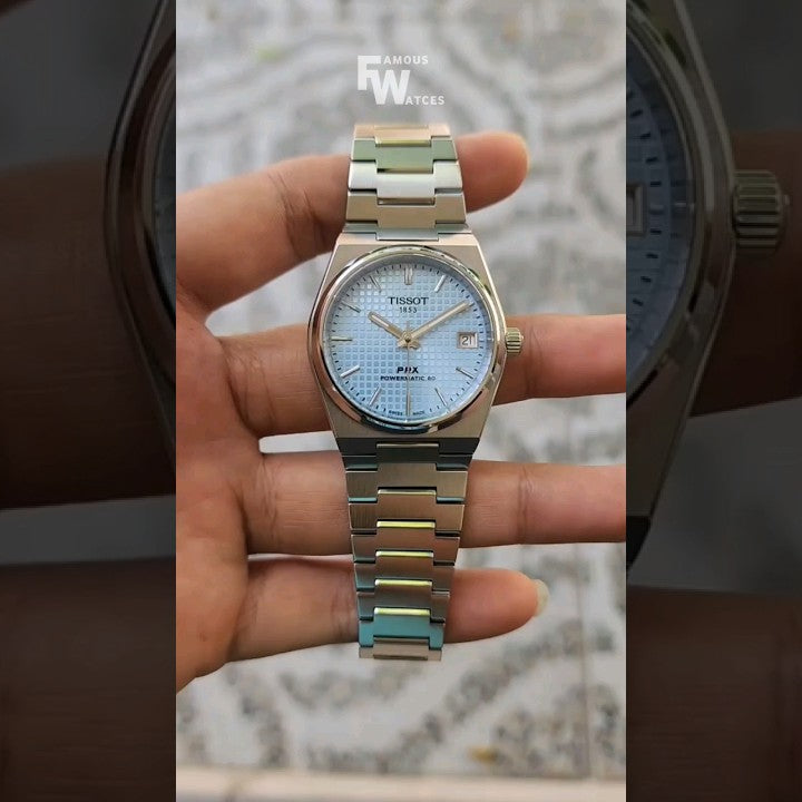 Tissot PRX 35mm Powermatic 80, where timeless aesthetics meet contemporary technology. This 35mm watch exhibits a high-quality steel case and a vibrant ice blue dial. This trendy shade casts an exquisite hue, perfectly catching and reflecting light. The distinctive waffle dial pattern adds a unique sophistication to this automatic model.