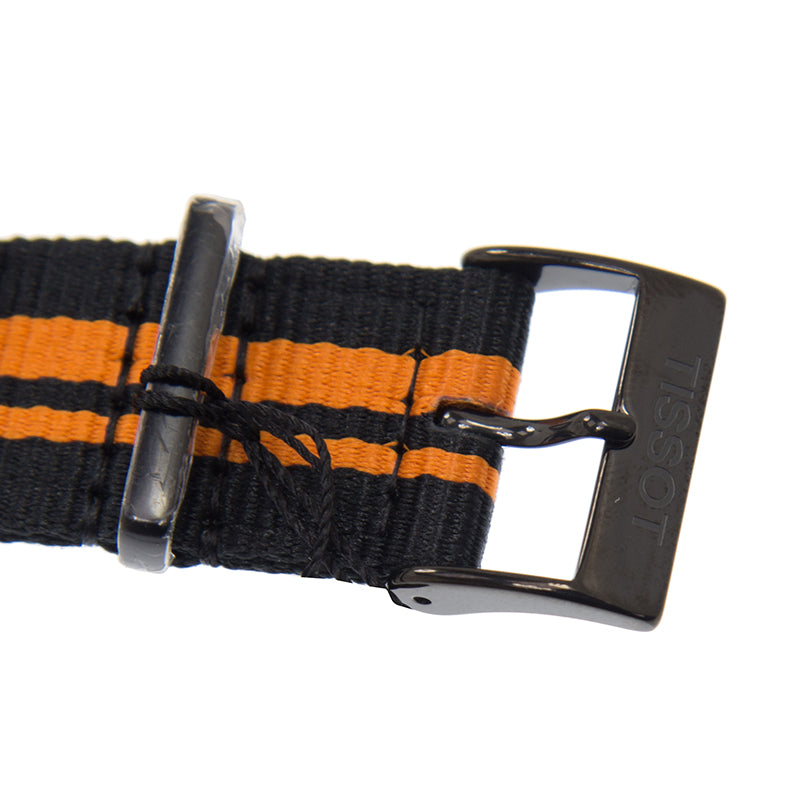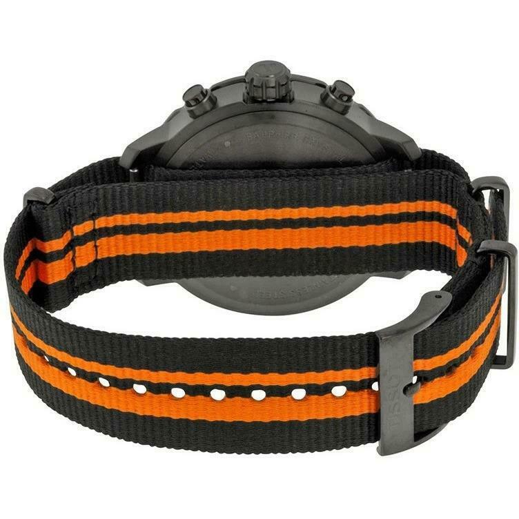 Black PVD stainless steel case with a black and orange synthetic nylon strap. Fixed black PVD bezel with an orange top ring showing tachymeter markings. Black dial with luminescent hands and index hour markers. Arabic numeral marks the 12 o'clock position. Minute markers around the outer rim. Dial Type: Analog. Luminescent hands and markers. Date display at the 4 o'clock position. Chronograph - three sub-dials displaying: 60 second, 30 minute and 1/10th of a second. Quartz movement. Scratch resistant sapphire crystal. Solid case back. Case diameter: 42 mm. Round case shape. Tang clasp. Water resistant at 100 meters / 330 feet. Functions: chronograph, date, hour, minute, second. Sport watch style. Watch label: Swiss Made. Tissot Quickster Chronograph Black Dial Black and Orange Synthetic Nylon Mens Sports Watch T0954173705700. Comes with an extra, all black, nylon strap.