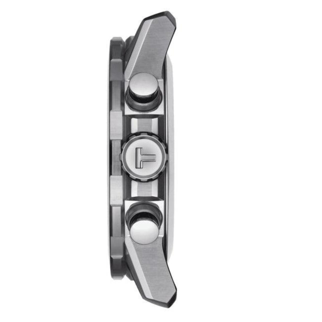 The Tissot T125.617.17.051.02 watch combines a 46mm round shaped stainless-steel case and black leather strap with textile detailing and a traditional buckle. It has a black analogue dial with two black luminescent hands with a yellow second tracker. Date is visible at position 6 with black chronograph sub dials and a tachymeter scale on the bezel, which is protected beneath sapphire crystal glass. Power is generated by the quartz movement. This model also has a water resistance of up to 100 metres.