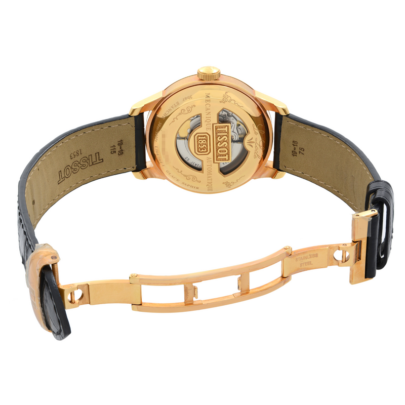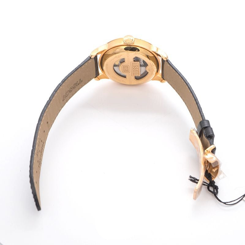 A classic automatic watch by Tissot with a black leather strap and a rose gold platted stainless steel case with a black dial.