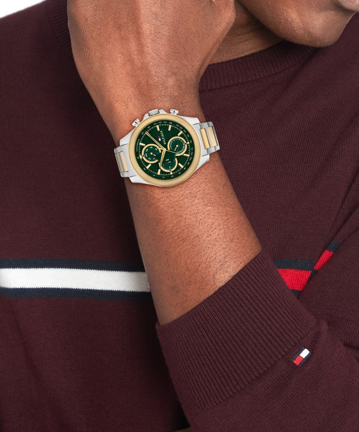 From the world-renowned designer, Tommy Hilfiger, this stunning Clark watch combines a classic look with current fashion trends. The 46 x 12mm two tone stainless steel case with gold tone textured bexel houses a green multi-dial with gold tone accents. A two tone stainless steel bracelet with double push button deployment clasp completes the look. 50m water resistant.
